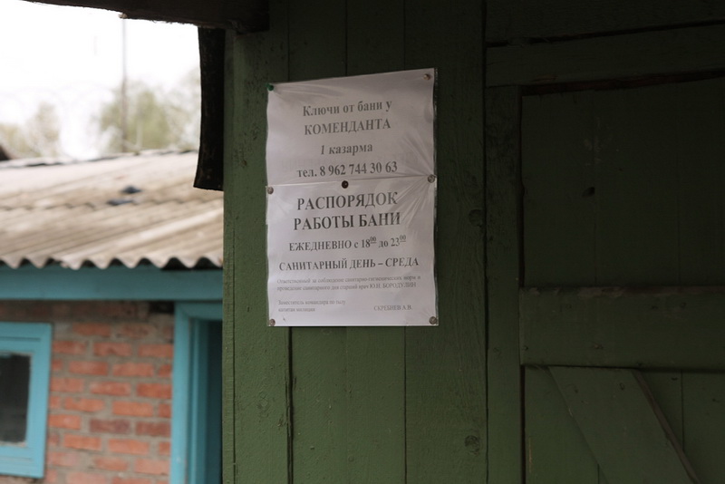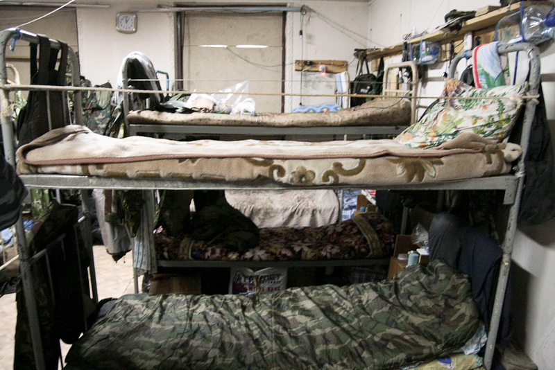 Условия жизни в лагере спартанские. Хотя часть милиционеров и живёт в переделанных под казармы корпусах пионерского лагеря, нескольким отрядам приходится довольствоваться палатками. Правда, палатками они кажутся только снаружи — они укреплены стенами из мешков с песком, внутри положен деревянный пол, проведён газ. Попав внутрь, чувствуешь себя очень уютно, по-домашнему… Шуршит в углу телевизор, сушится на верёвочках одежда, подогревается на огне обед. Скоро ребята придут с боевого выхода. Надо будет их накормить, дать переодеться в чистое сухое бельё. Несколько бойцов всегда остаётся на базе…