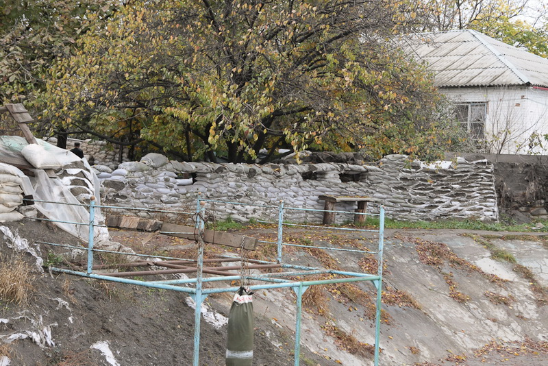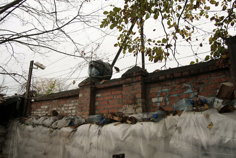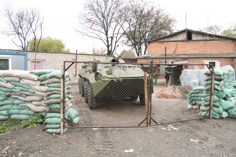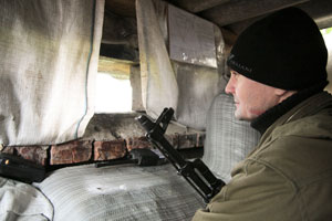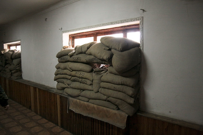 Поднимаюсь в одну из укреплённых мешками с песком кирпичных будок. Там боец ОМСН Олег, сейчас он на посту. Весёлый. Шутим, смеёмся… Даёт сделать карточку, как он смотрит в бойницу за своим сектором. Подхожу к бойнице. Смотрю туда.