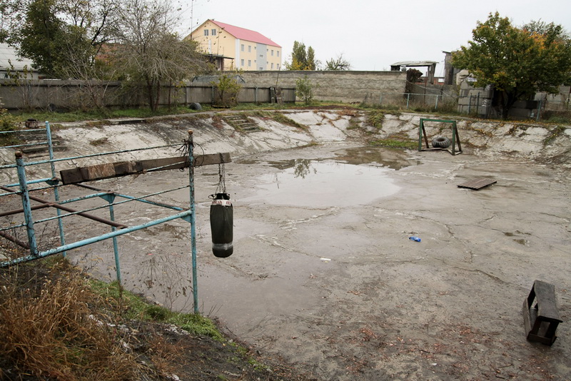 В лагере практически все занимаются спортом. Уж в футбол так вообще играют все. Регион на регион. Под футбольное поле используют старый бассейн под открытым небом. Удобно, говорят, да и мячик за пределы лагеря не улетает. На одном крае бассейна разобранный остов подбитого БТР-80, на другом — обожжённые взрывами гранат из подствольника укрепления из мешков с песком. Когда-то тут шли бои.