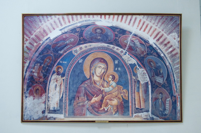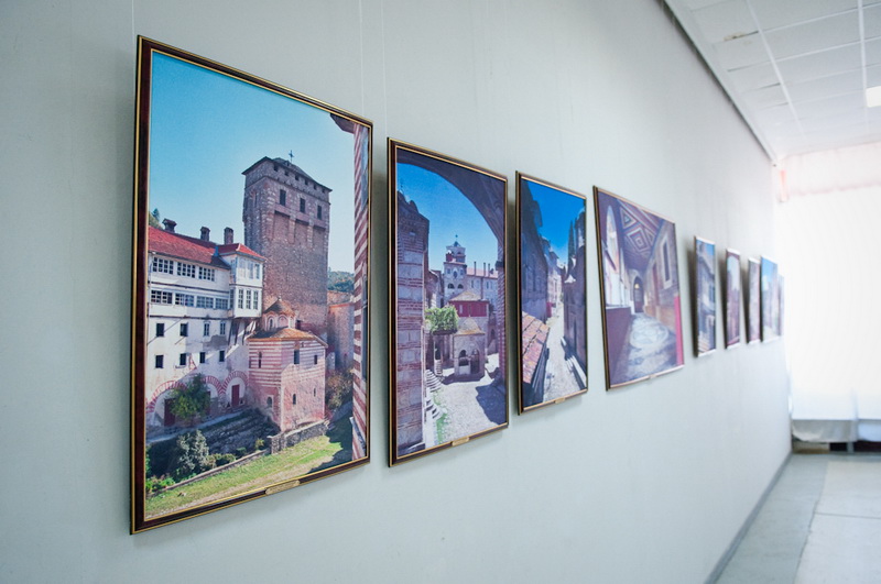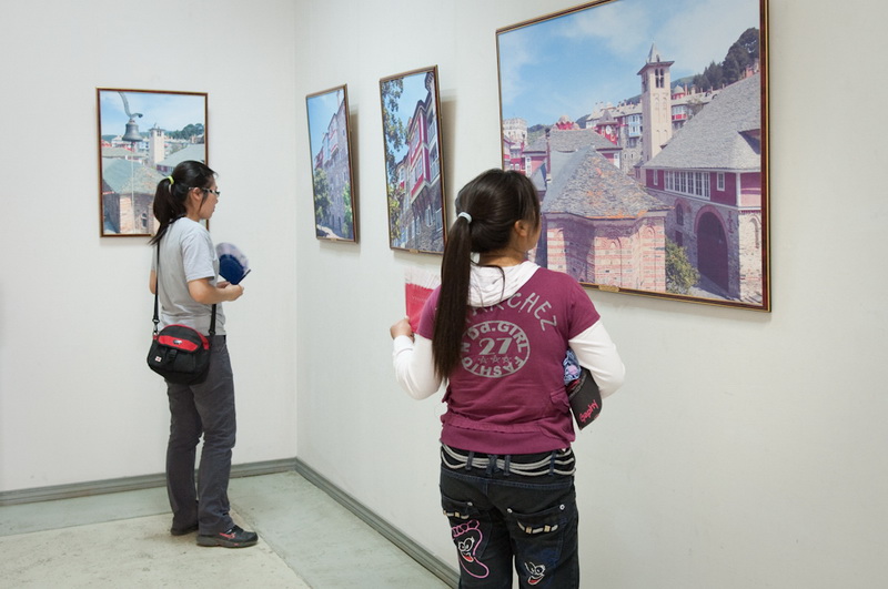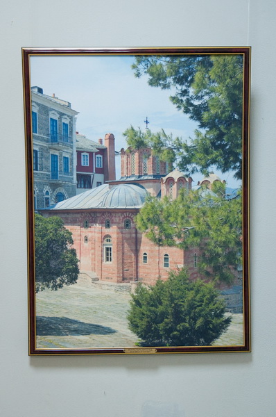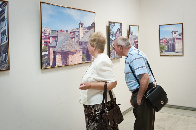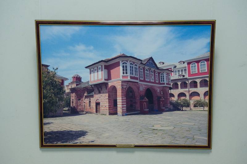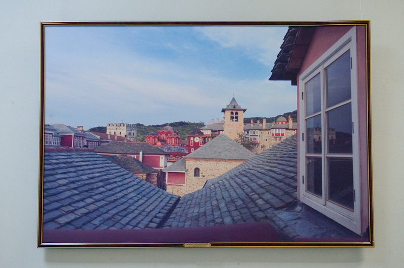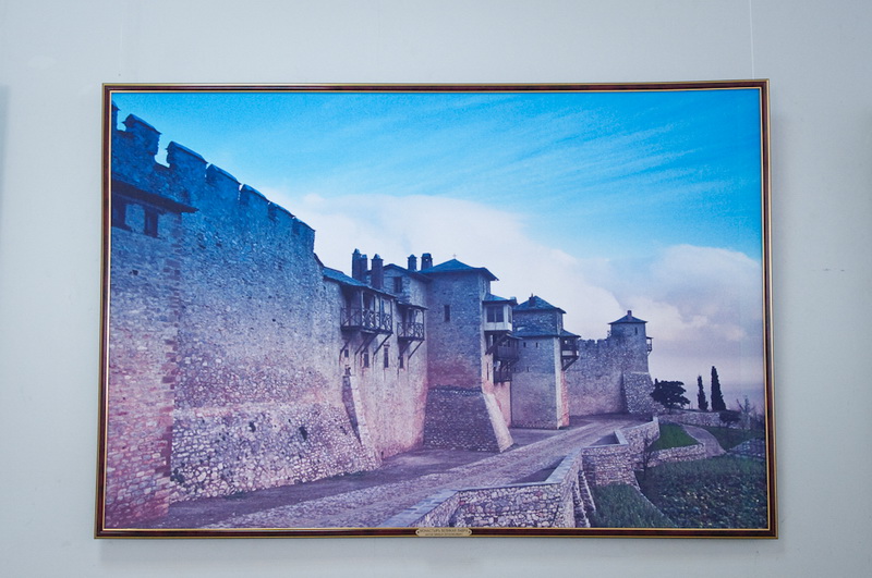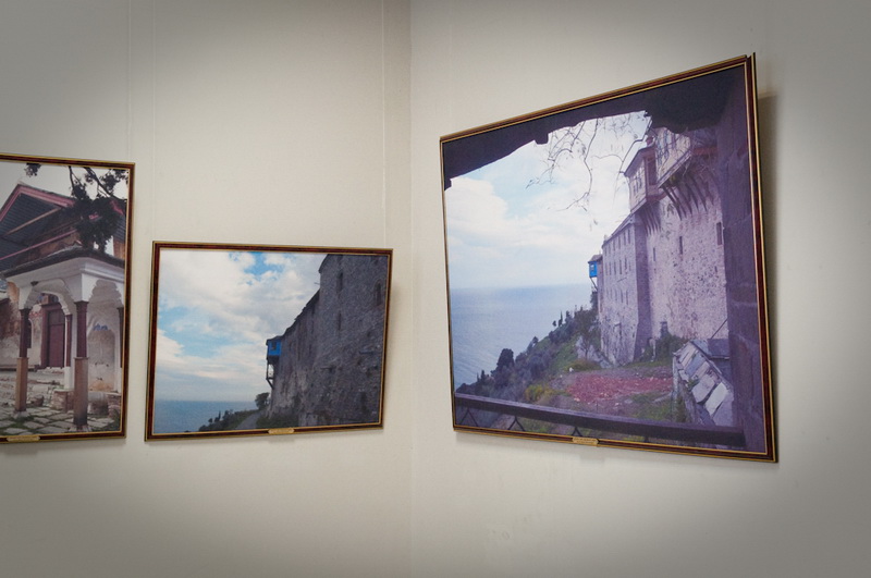 Впрочем, выставка «Гора Афон — сияние святынь. Сто фотографий на полотне святогорских монастырей» привлекает не только тематикой, но и исполнением — все фотографии распечатаны на холсте. Правда, не на полотне святогорских монастырей, как можно подумать, если вдумчиво прочитать название, а на обычной текстурной ткани. Тем не менее, крупноформатные работы действительно выглядят весьма необычно и декоративно. Для удобства просмотра все залы выставки посвящены отдельным монастырям, содержат информационные стенды с бытописанием и историей культовых мест, а каждая фотография имеет подпись, поясняющую, где она сделала. В противном случае непосвящённому зрителю немудрено заблудиться — архитектура монастырей и хозяйственные постройки на территории Афона очень похожи. А так как план выставочного зала позволяет обойти всю экспозицию по кругу, возникает ощущение бесконечного кружения в лабиринте домиков и мощёных булыжником улочек, мимо одних и тех же стен, башенок, окошек. Хотя, если приглядеться повнимательнее, ощущение дежавю оказывается не ошибочным — в экспозиции встречаются дублированные фотографии. Причём не просто одни и те же архитектурные объекты, снятые с одной и той же точки (хотя таковых тоже хватает), но и вовсе одинаковые снимки, распечатанные с одного и того же кадра. Объяснить причину такого нетипичного поступка сложно — не то работ на все стены не хватило и пришлось имеющиеся дублировать, не то одинаковые работы повесили по недосмотру. Однако красоту фотографий это ничуть не умаляет.