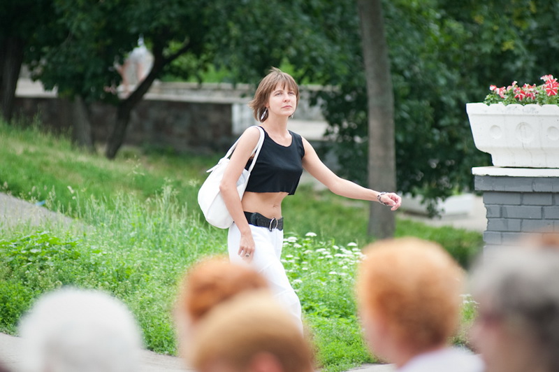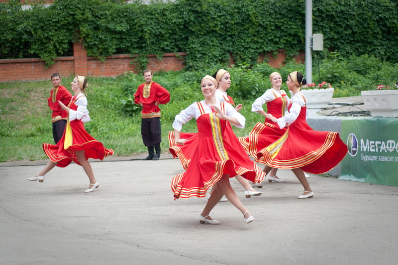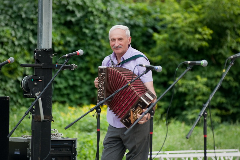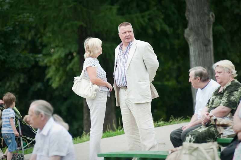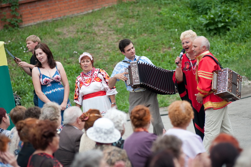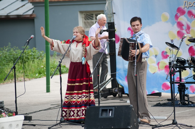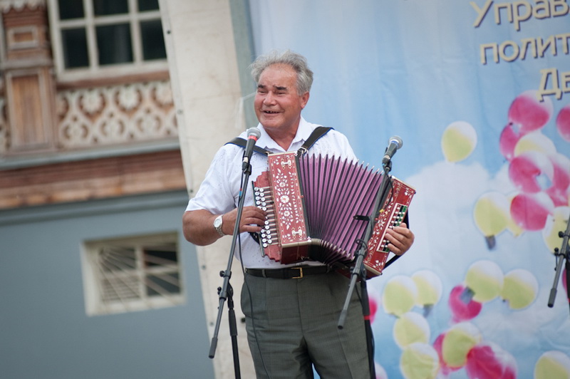На самой сцене тем временем шёл концерт, подготовленный, как было сказано выше, коллективами Дворца молодёжи и традиционными участниками фестиваля «Играй, гармонь!». Пенсионеры, выбравшие местом субботнего досуга горпарк, смогли послушать песни своей молодости и потанцевать под каверы Юрия Антонова. Наиболее активные деятели импровизированной танцверанды получали подарки от организаторов: пирожки и минеральную воду. Но настоящее действо началось после объявления «баттла гармонистов». Публика вряд ли поняла, что такое «баттл», да и сами участники, скорее всего, тоже не до конца разобрались в терминологии. Однако появление на сцене конкурсантов традиционного музыкального фестиваля «Играй, гармонь!» было воспринято на ура — зрители подпевали душевным песням и активно горланили частушки. Гармонисты оказались настолько самодостаточны, что после «обязательной» сценической программы и вовсе вышли в народ — вооружившись микрофонами, они спустились с концертной площадки и понесли смех и радость людям. В этом месте стало понятно, что никакие народные танцевальные коллективы, которые должны были продолжать программу праздника, публике уже не нужны.