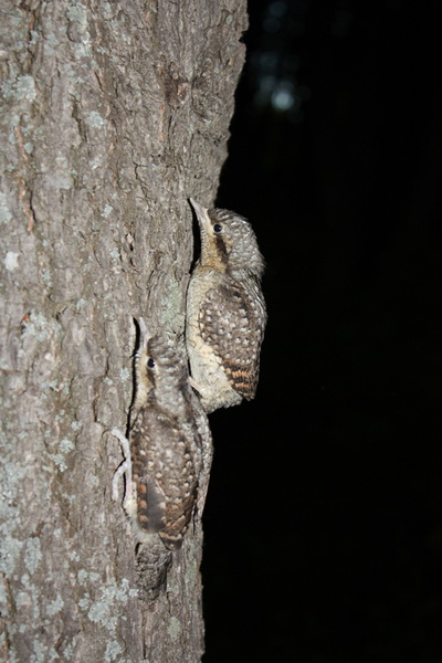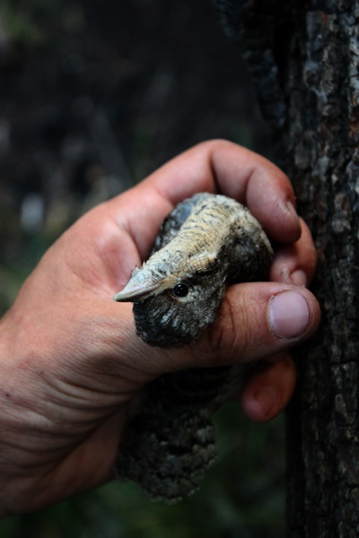 Два брата (а там, кто их знает) «вертишея» спокойно даются в руки орнитологу, но посматривают друг на друга с укоризной. На бревне им пока вполне удобно, но пройдёт ещё минута, и они нелепо разбегутся в противоположные стороны.
