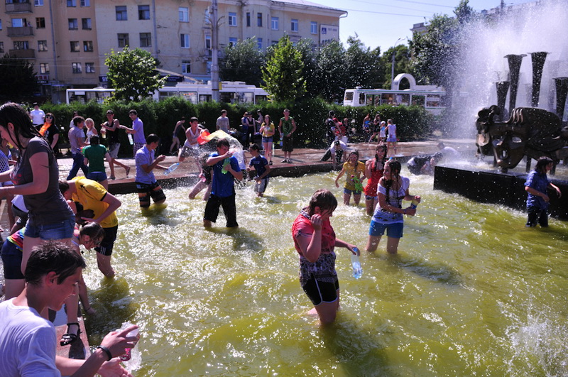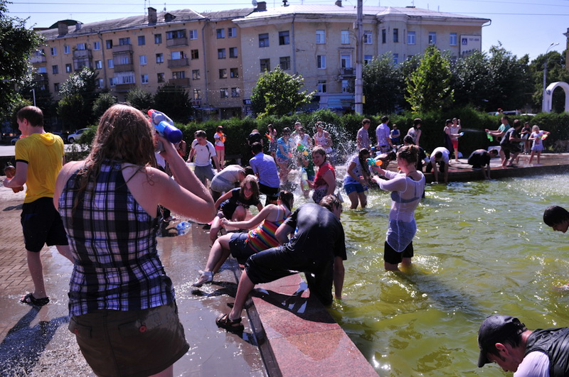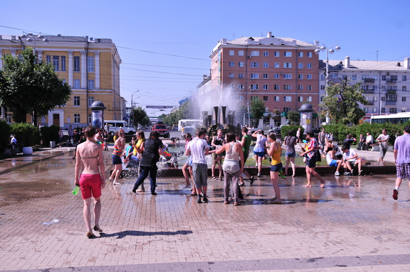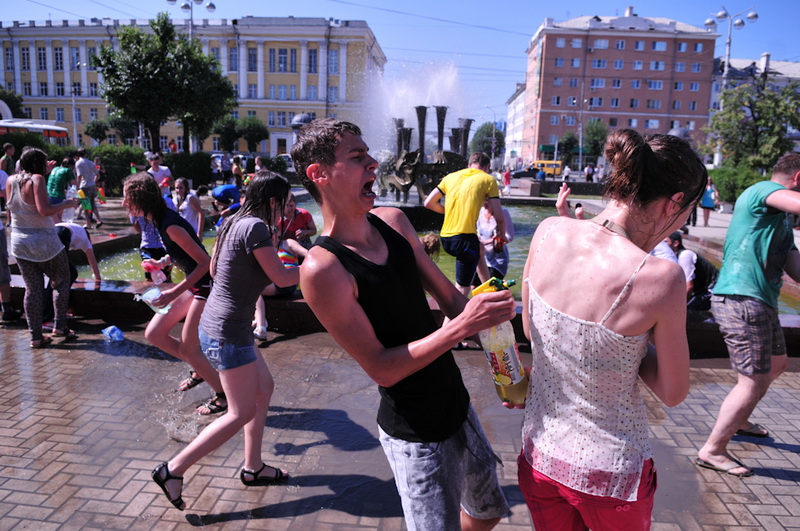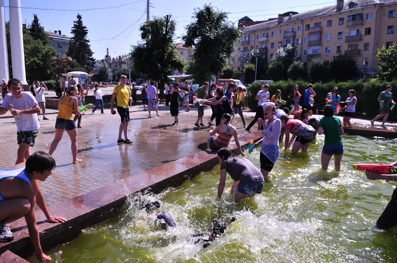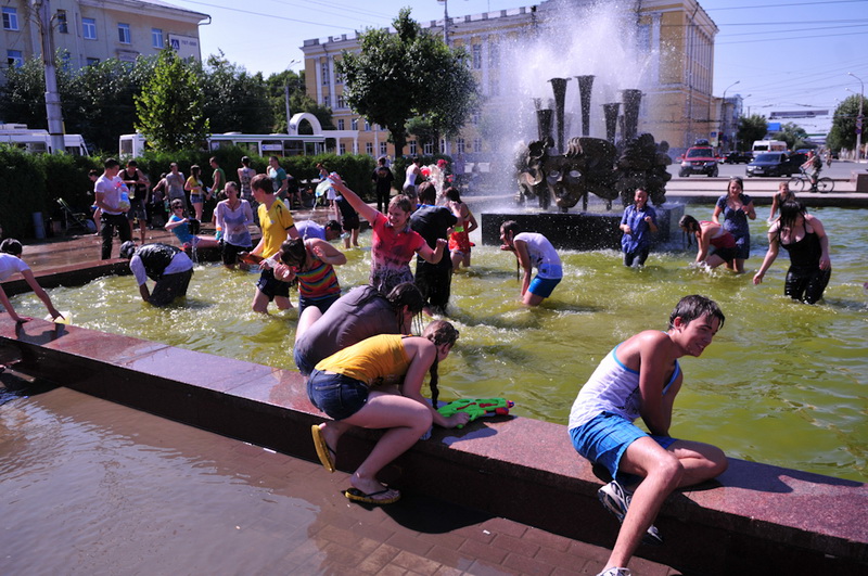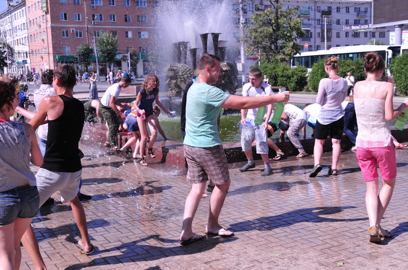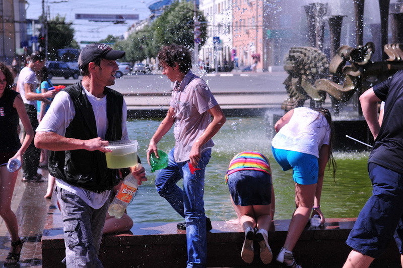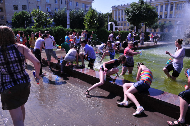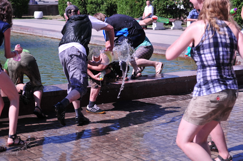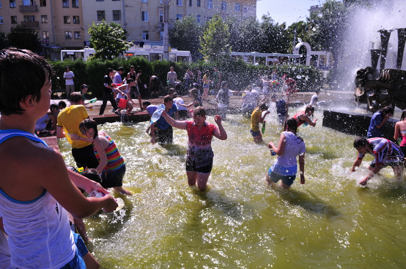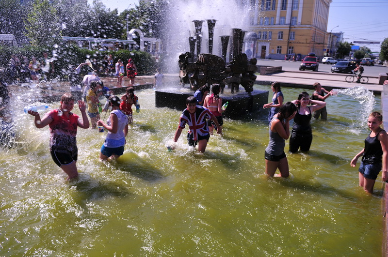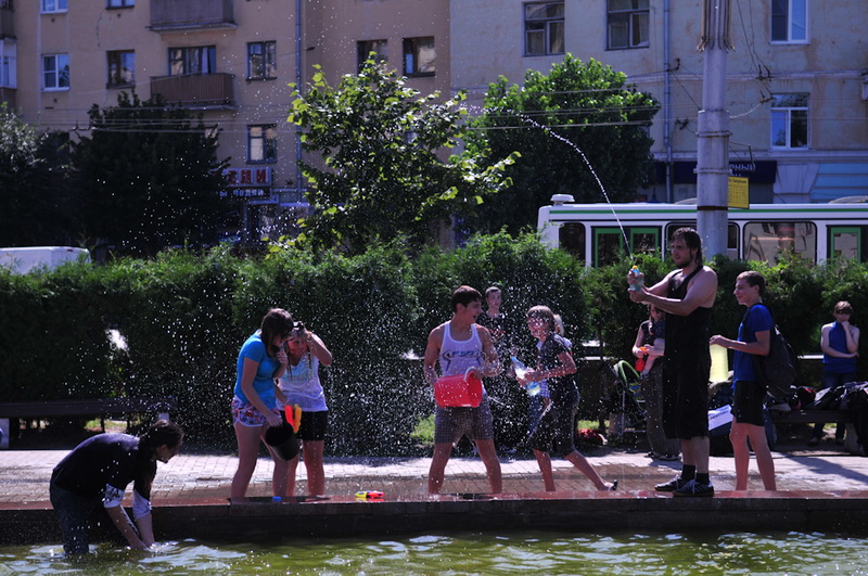 О жаре забылось как-то сразу. Вокруг появилось вдруг столько воды, что вспомнилось про тропический ливень — даже стоять неподалёку было сыро, не то что находиться в гуще события. Кстати, журналистам, снимавших всё это, тоже досталось по самое не могу. Добавил пикантности и конкурс девичьих маек, который невольно организовали . Единственным способом не попасть под струю было дождаться, когда у озверевших бойцов кончатся патроны. Вот они кончились, и все участники кинулись в фонтан — кто купаться, кто заряжать свои стволы. Впрочем, это всё происходило очень быстро — прошмыгнуть удавалось лишь двум-трём прохожим, остальным выйти сухими из воды не получилось. Однако, судя по улыбкам как самих участников, так и случайно пострадавших прохожих, происходящее всем понравилось.