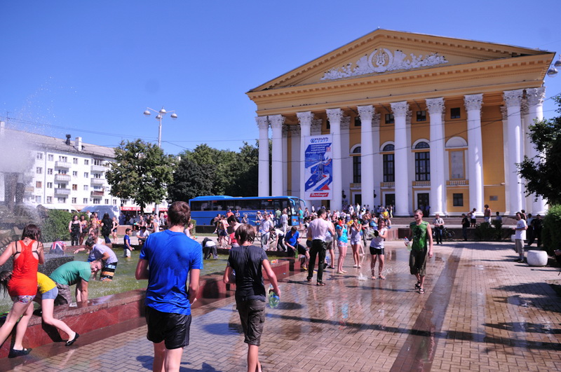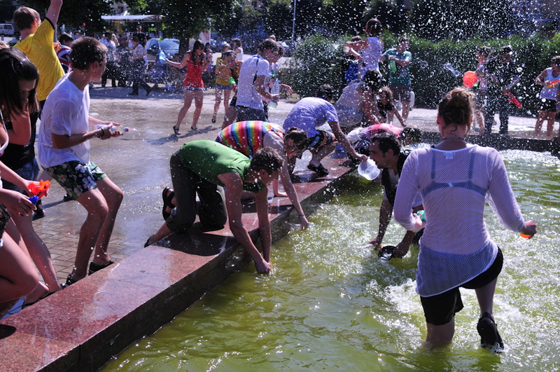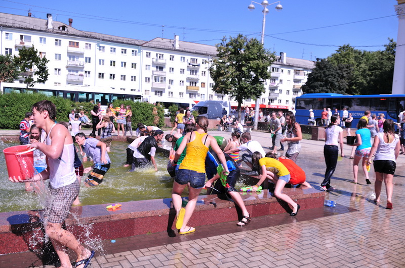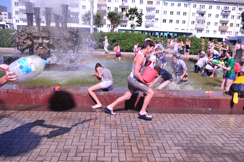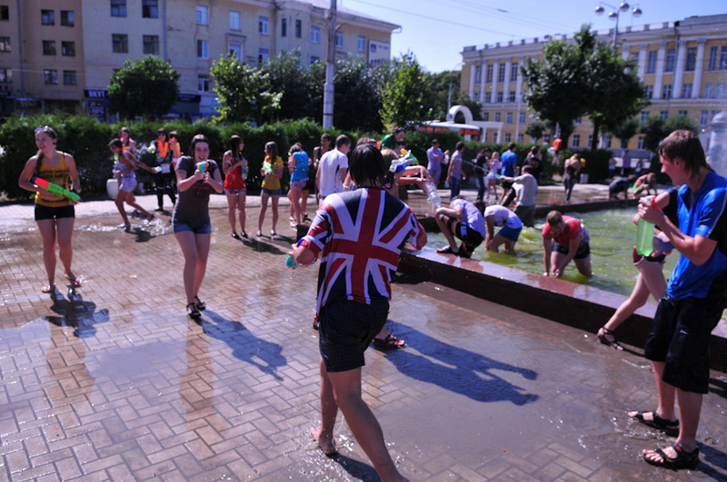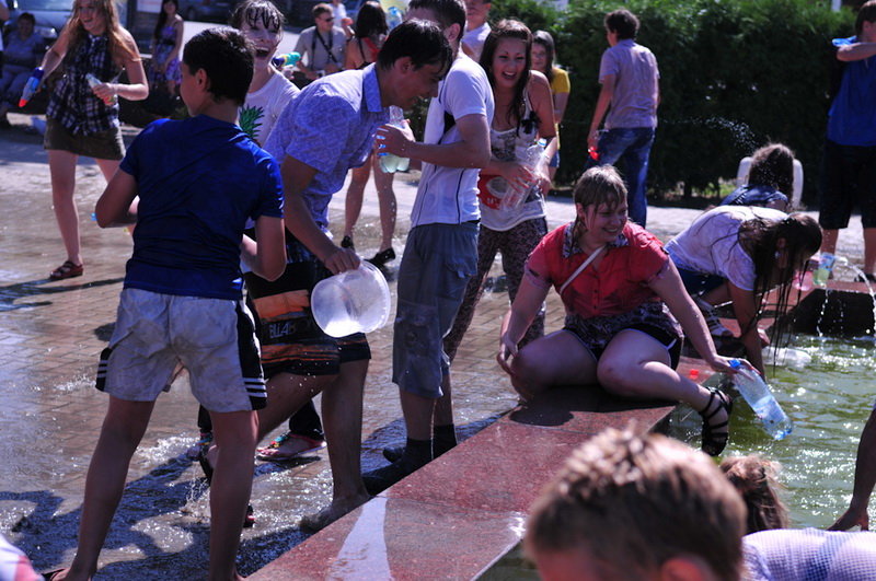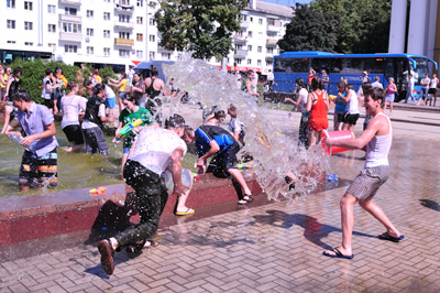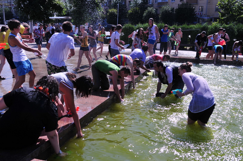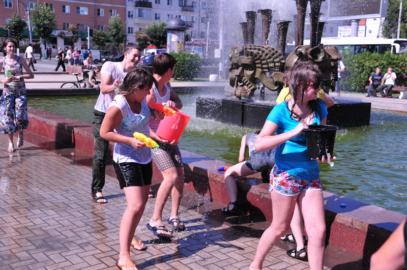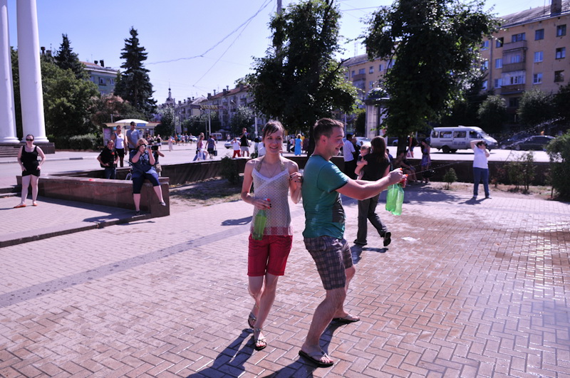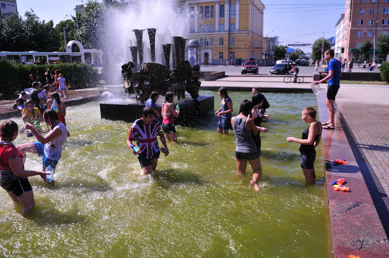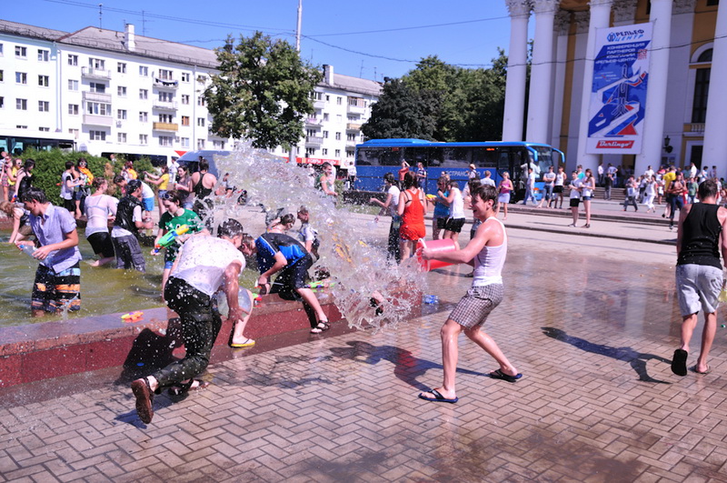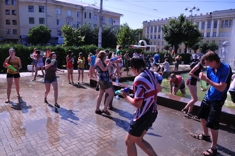 О жаре забылось как-то сразу. Вокруг появилось вдруг столько воды, что вспомнилось про тропический ливень — даже стоять неподалёку было сыро, не то что находиться в гуще события. Кстати, журналистам, снимавших всё это, тоже досталось по самое не могу. Добавил пикантности и конкурс девичьих маек, который невольно организовали . Единственным способом не попасть под струю было дождаться, когда у озверевших бойцов кончатся патроны. Вот они кончились, и все участники кинулись в фонтан — кто купаться, кто заряжать свои стволы. Впрочем, это всё происходило очень быстро — прошмыгнуть удавалось лишь двум-трём прохожим, остальным выйти сухими из воды не получилось. Однако, судя по улыбкам как самих участников, так и случайно пострадавших прохожих, происходящее всем понравилось.