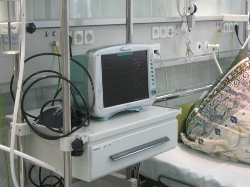 Работу медицинской сестры в этой палате существенно облегчает современная реанимационная тележка, на которой можно не только разместить все нужные медикаменты, но и установить штатив для капельницы или другое медицинское оборудование. Кроме этого, на каждом рабочем месте до 12 параметров регистрируются с помощью реанимационного монитора. Все мониторы соединены в одну центральную станцию наблюдения, которая позволяет подключить до 66 мониторов. Заведующий отделением может за рабочим местом наблюдать жизненно важные параметры каждой «подключённой» пациентки. При переводе пациентки из палаты интенсивной терапии в палатное отделение информация о её состоянии сохраняется в электронном виде, подтверждая то, что параметры стабильны, и она может быть переведена.