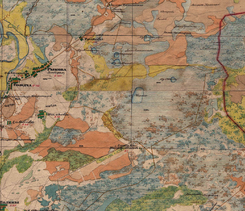 Как вариант, в путь можно отправиться из Полково к Поганому озеру. На вопрос как пройти, местные жители не ответят, поскольку в большинстве своём они совсем не местные, а рязанские и московские дачники. Путь надо держать через Полково на восток в сторону деревни Лопухи. Накатанная песчаная дорога пересекает елово-сосновый лес и километров через пять упирается в южную окраину Красного болота. Мимо не пройдёшь — это красная поляна километров в 10 диаметром. Ещё пять лет назад здесь стоял невысокий, но крепкий лес из вялой сосны и берёзы. Посреди болота в кольце из ольхи лежит Чёрное озеро диаметром в один километр ― оно самое большое из боровых озёр, по площади как пять Ласковских. Подходя к Красному болоту можно натолкнуться на сетку-рабицу, за которой ней прыгают зайцы, а, по рассказам местных, ещё и олени. Внутрь нельзя — это частная территория с названием Потеряевка. Держаться нужно левее.