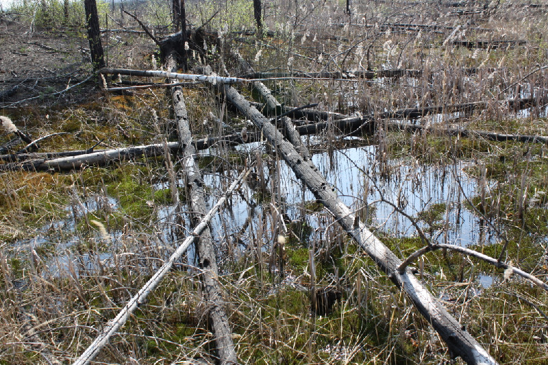 Красное болото можно, конечно, вовсе обойти (целее будете). Но если, как в русских сказках, топать напрямик, то вас ожидают все прелести короткого пути. Болото давно осушили, и трясина не поглотит, но главное препятствие — результат пожара 2007 года. Усилия пожарных помогли отстоять деревню Лопухи, но Чёрное озеро было выкачано почти до дна. Поговаривают, что после «разлива» лопушане ещё месяц ходили на озеро с корзинами, опустошая оставшиеся от озера лужи от рыбы. Следы пожарища — бескрайний навал сосны и берёзы, поросшие мхом, ветки старательно прокалывают даже резиновые сапоги, а непредсказуемые лужи заливают их (сапоги) болотной жижей. Пересекая болото, можно столкнуться и с дополнительной проблемой в виде осушительных каналов шириной до двух метров. Переходить их вброд не рекомендуется из-за метрового слоя ила. Лучше навести мосты из горельника. А можно воспользоваться переправой в виде бобровых плотин. Грызуны-трудоголики после начала работ по осушению болот решили не сдавать территорию и, перегораживая каналы, тормозят водосток, сохраняя в торфяниках воду.