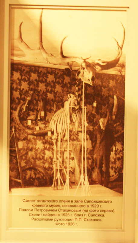 А дело было 8 июля 1926 года на реке Сапожок в двух километрах от самого городка. Крестьянин села Канино шёл на базар. Видимо, гулял, потому как не шлось ему по основной дороге, а свернулось к берегу реки. Остановившись у родничка, увидел торчащий из торфяного пласта рог. Покопался и убедился, что не так-то просто будет этот рог вытащить. О своей находке путешественник сообщил директору музея, после чего всю неделю рабочие отводили в сторону воду и бережно откапывали находку. Вскоре открылся взору скелет исполинского оленя, который высушили и на металлическом каркасе смонтировали в музее.