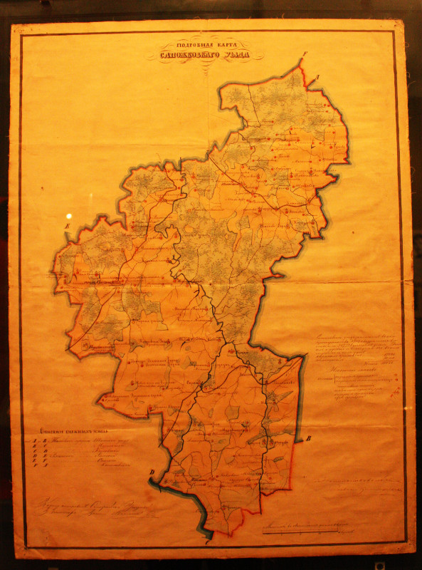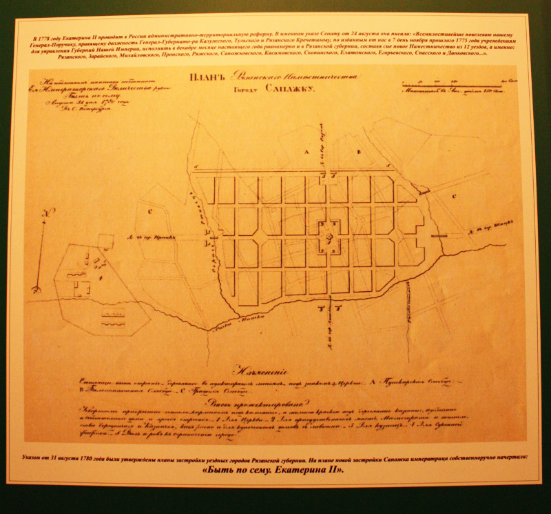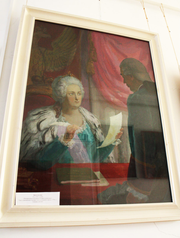 В узких залах музея почти затерялась картина местного художника Гущина «Быть по сему». Почти приближённым к реальности изображением Екатерины II художник напоминает о величайшем для Сапожка событии — подписании Указа о присвоении статуса уездного города в 1778 году. Проводя административно-территориальную реформу, императрица разделила Рязанскую губернию на 12 уездов. Уже через два года появился новый план застройки Сапожка. Так Сапожок стал административным центром Сапожковского уезда. Городу присвоили герб и даровали 422 десятины земли.