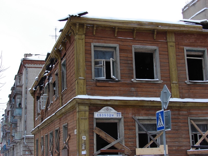Однако бывают случаи, когда погорелые здания так и стоят годами в виде бесполезных головёшек. Так произошло, к примеру, с домом Любомудрова и зданием кустарного училища купца Ларионова на Новослободской. Снести окончательно их нельзя, поскольку остовы домов числятся памятниками архитектуры, а о восстановлении никто не заикается. И всё же в Рязани есть уникальное в этом отношении деревянное (в настоящее время предназначенное для жилья!) здание бывшей Губернской канцелярии, которое пережило два пожара — и при этом продолжает в восстановленном виде служить людям. Речь идёт о доме №77, стоящем на перекрёстке улиц Свободы и Фрунзе.
