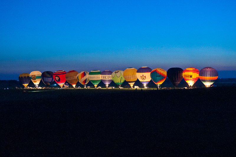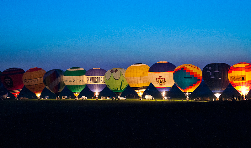 Ночное свечение «Неба России» также проходит на берегу Оки, но значительно позже, с наступлением темноты. В сумерках пилоты выстраиваются в линию и поднимают оболочки, оставляя сами аэростаты на короткой привязи. Пламя горелок подсвечивает яркие полотнища ткани, которые гигантскими светильниками буквально полыхают на фоне ночного неба. Полюбоваться на уникальное зрелище собирается внушительное число зрителей — солотчинская трасса близ моста через Оку зачастую превращается в единую несанкционированную парковку. Впрочем, недовольных тут не бывает, даже сотрудники ДПС уже махнули палкой гонять впечатлительных водителей.