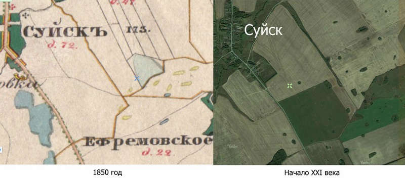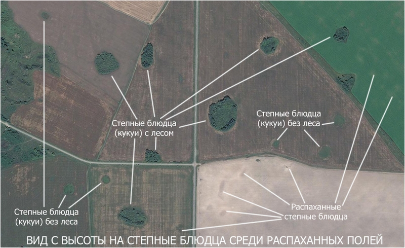 Может, островки суйского леса посажены специально, дабы остановить рост оврагов? Нет. Может, выращены для целей охоты? И здесь промах. В народе к ним издавна применяют слова «ивовый куст», «берёзовый колок», «осиновый куст», а всех вместе кое-где называют словом «кукуй», а по-научному — суффозионная западина или «степное блюдце». Леса эти имеют природное происхождение, растут сами по себе, и сколько ни вырубай, упрямо восстанавливаются на тех же местах. На карте из атласа Менде 1850 года к востоку от Суйска среди пашен видна россыпь пятен жёлтого цвета. Так изображали луга и болотины. На современном снимке с большой высоты кукуи сидят на тех же местах, но в гораздо большем количестве. Видимо, раньше люди их всё же пытались пахать, но позднее смирились. Не растёт тут рожь, и ничего не поделаешь.