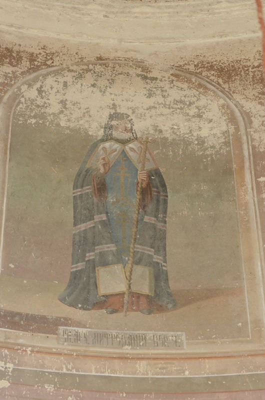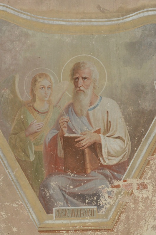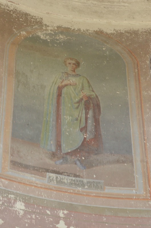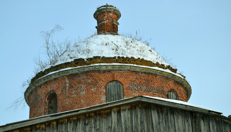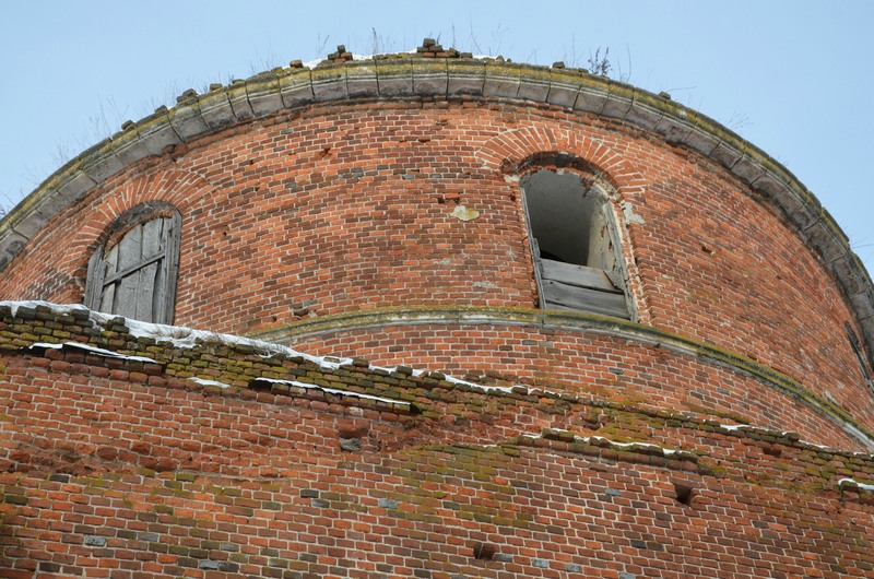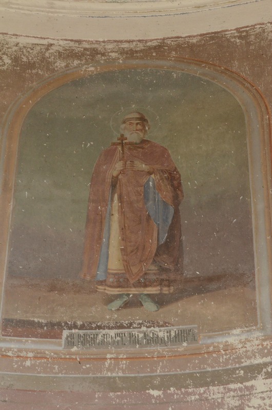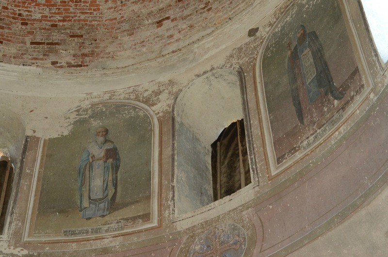 Ещё выше, в барабане под куполом, в полный рост разместились креститель Руси Владимир Красное Солнышко и изобретатели азбуки Кирилл и Мефодий, причём Кирилл держит развёрнутый свиток, где в пяти рядах уместились аршинные буквы от «аз» до «ижицы». Прихожане храма во время богослужения могли одновременно осваивать грамоту и письмо, а храм служил не только культурным, но и образовательным центром села. До тех пор, пока в советские годы его не заменили культмассовыми мероприятиями, а затем и дискотеками в сельских клубах.