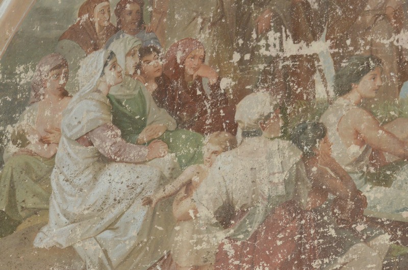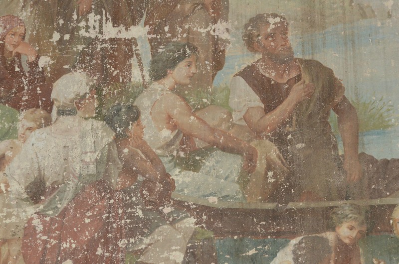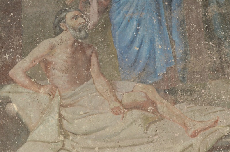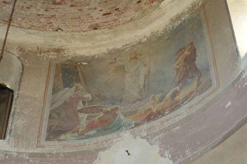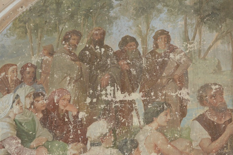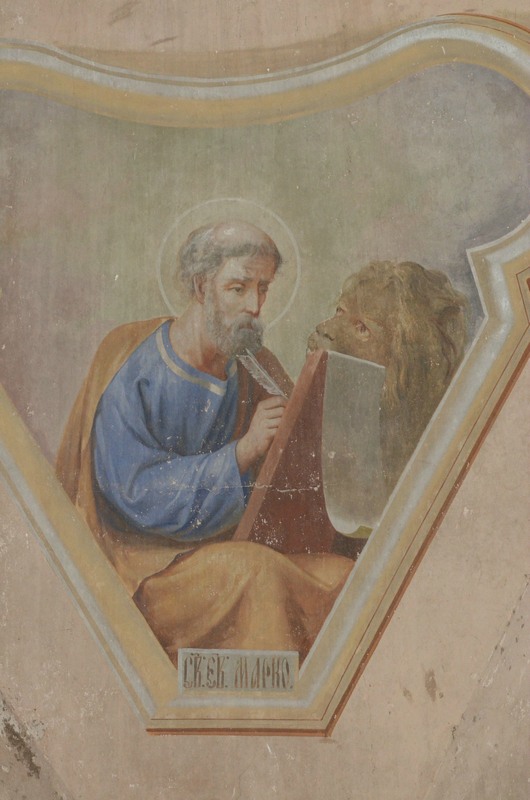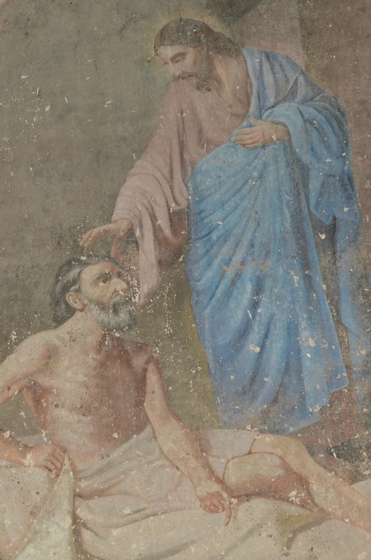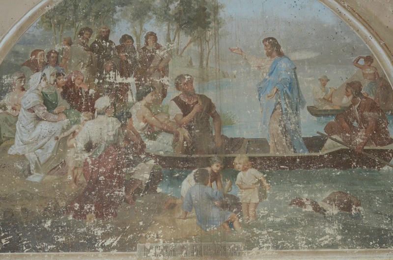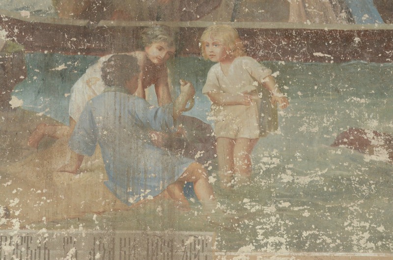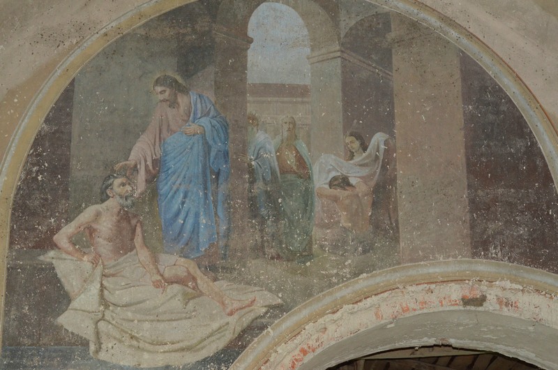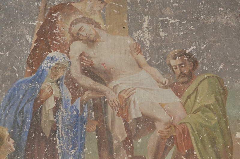 При входе первыми бросаются в глаза огромные живописные картины слева, справа и напротив алтаря. На левой, то есть северной стене угадывается одно из чудес Христа, когда Спаситель накормил пять тысяч людей пятью хлебами и двумя рыбинами. На фреске Иисус стоит в лодке, на берегу под сенью низкорослых деревьев видит множество людей, на переднем плане трое детей, в руке одного из мальчишек зажата вёрткая рыбина. На противоположной стене показана сцена Снятия с креста. Состояние вселенской скорби и человеческой несправедливости переданы столь пронзительно, что заставляют вновь и вновь неотрывно рассматривать фреску. Двое мужчин, видимо, Иоанн Богослов и Иосиф Аримафейский, снимают измученное тело — в правом боку Христа видна кровоточащая рана. Дело это непростое: к перекладине креста приставлена лестница. Один из мужчин, видимо, евангелист Иоанн, стоя на лестнице, удерживает тело под руки, Иосиф же обхватывает бёдра и колени Христа. Голова Спасителя безжизненно упала на правое плечо. Богоматерь узнаваема по синей тунике: от горя она повесила голову, десницей едва касается правой руки невинно убиенного сына, в левой прижатой к груди руке держит белый платок. Припавшая на колени Мария Магдалена держит длинное белое полотнище — ту самую Плащаницу.
