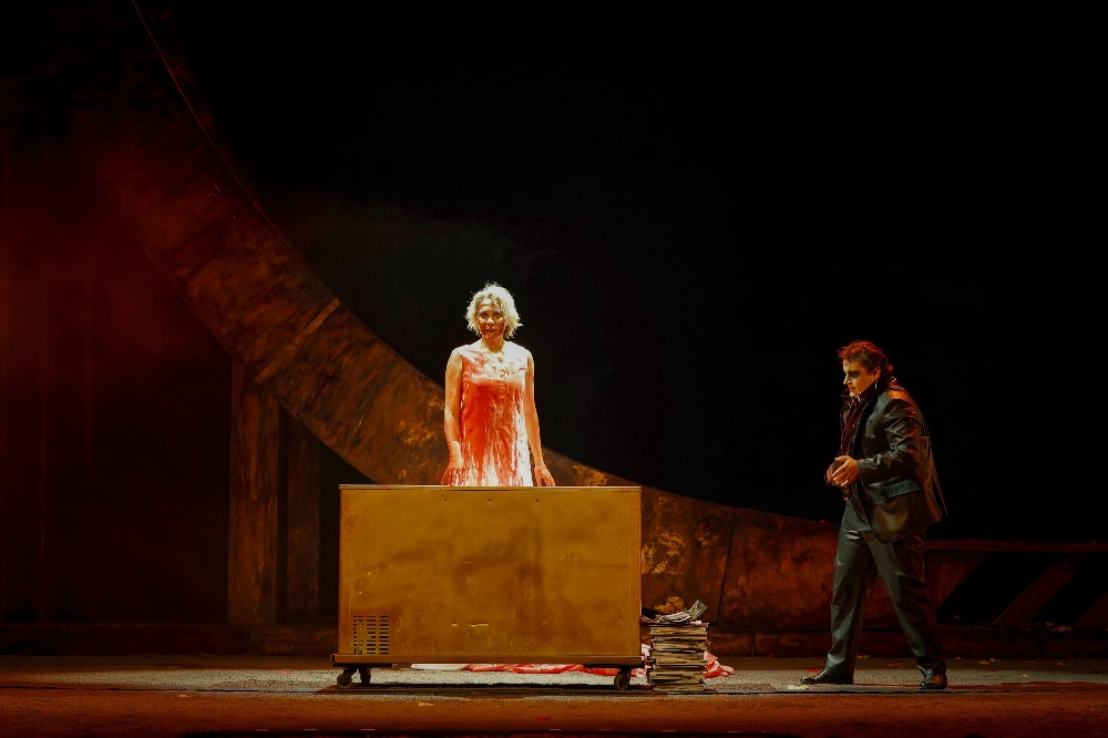 Отдельно хочется отметить оригинальную конструкцию декорации, расположенную на поворотном круге сцены. С одной стороны — дозорная башня и колесница, с другой — олицетворение царской власти и пути как к её вершине, так и в небытие.