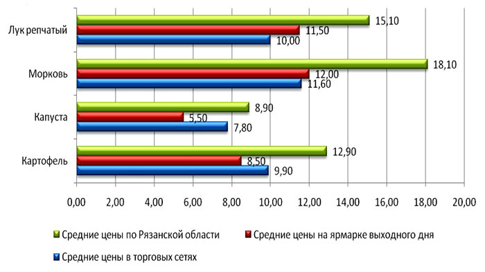 По итогам февраля был проведён анализ цен на овощи в магазинах торговых сетей, который показал, что в них цены на плодоовощную продукцию поддерживаются на достаточно низком уровне, сопоставимом с ярмарками выходного дня в Рязани, и значительно ниже среднестатистических по Рязанской области. По состоянию на 1 марта, средняя розничная цена на картофель составляет 9,9 рубля за килограмм, что ниже среднеобластной на 23,3%, белокочанную капусту — 7,8 рубля — на 12,4%, репчатый лук — 10 рублей — на 33,8%, морковь — 11,6 рубля за килограмм — на 35,9%. Наиболее низкие цены на плодоовощную продукцию наблюдаются в торговых сетях «Метро», «Глобус», «Лента», «Дикси», «Пятёрочка», «Наш» и «Барс».