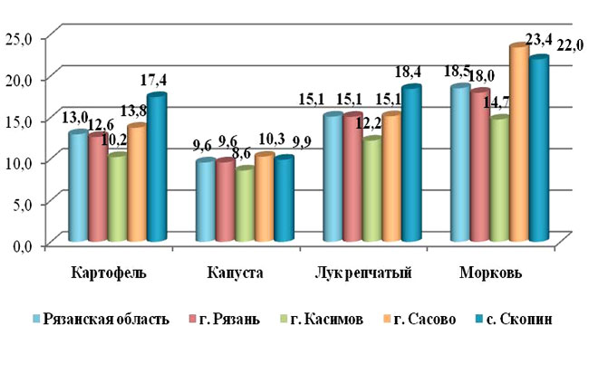 В группе плодоовощной продукции самые высокие цены наблюдаются в Сасово, низкие — в Касимове.