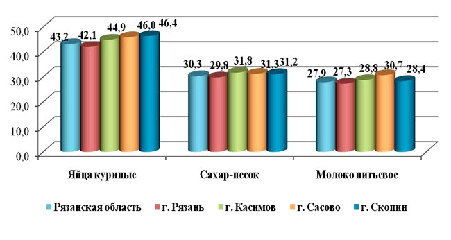 Наибольшие цены на куриные яйца отмечены в Скопине 46,4 руб./дес. (при среднеобластной — 43,2 руб./дес.), на сахар-песок — в Касимове 31,8 руб./кг (при среднеобластной — 30,3 руб./кг) и на молоко — в городе Сасово 30,7 руб./л (при среднеобластной — 27,9 руб./л).