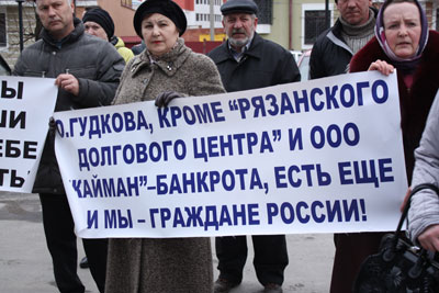 Напомним, что дело в отношении «Каймана» при вмешательстве правительства Рязанской области, которое учредило совместно с администрацией города открытое акционерное общество «Регионстройдом». Началась проверка проектно-сметной документации недостроя. Оксана Гудкова была назначена арбитражным управляющим в сентябре 2011 года с целью провести инвентаризацию и сделать оценку имущества должника. Дольщики, в свою очередь, сомневаются, что Гудкова действует в их интересах. Дольщики требовали отстранить Гудкову от должности, заявляя, что «за полгода работы ею не было предпринято никаких действий». По словам митингующих, арбитражный управляющий выступает на стороне кредиторов — «Рязанского долгового центра», который, по их мнению, работает против дольщиков. Пикетчики смогли лично пообщаться с Оксаной Гудковой, высказав ей свои претензии.