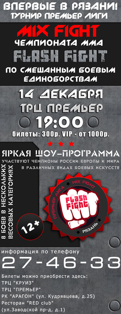 Соревнования в Рязани не обойдутся без красочного действа и развлекательной шоу-программы. В перспективе в Рязани планируется провести серию премьер-лиги Mix Fight чемпионата ММА России «Flash Fight» по смешанным единоборствам. Первый турнир состоится, 14 декабря, в пятницу, на третьем этаже торгово-развлекательного центра «Премьер» в 19.00.