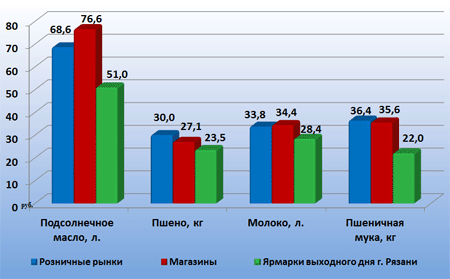 Еженедельно на пяти ярмарочных площадках в среднем реализуется от 20 до 27 тонн продовольственного картофеля, 3-3,5 тонны белокочанной капусты, 1,5-2 тонны моркови и другой плодоовощной продукции, выращенной рязанскими сельхозпроизводителями и гражданами, занимающимися садоводством и огородничеством. На ярмарках выходного дня также по более низким ценам, чем в магазинах и на рынках, реализуются молоко, пшено и пшеничная мука.