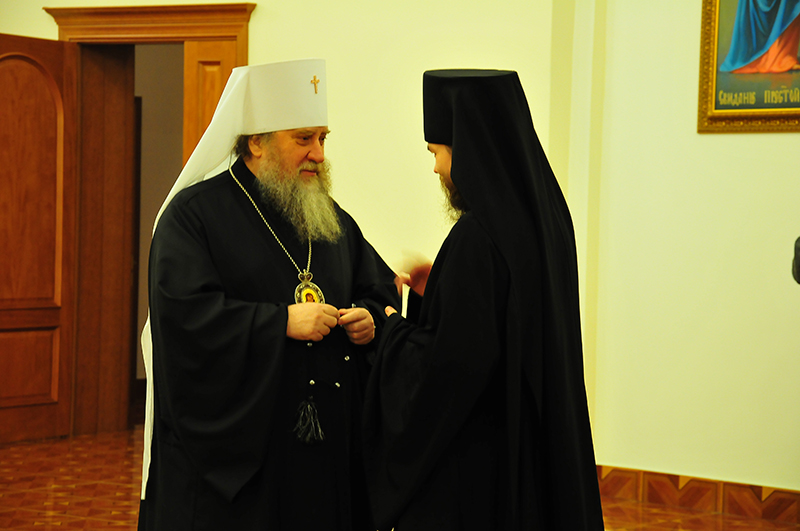 После общения с духовенством митрополит Вениамин проследовал в домовый храм епархиального управления в честь пророка Илии, где молился за благодарственным молебном, который совершил протоиерей Николай Сорокин в сослужении протодиакона Анатолия Ковшикова, .