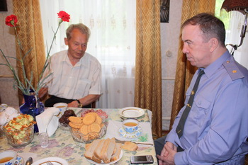 О своей нелёгкой судьбе ветераны рассказали в дружеской беседе за чашкой чая Ивану Перову, сообщает Генерал высказал много тёплых слов в адрес пенсионеров и вручил им цветы и подарки.