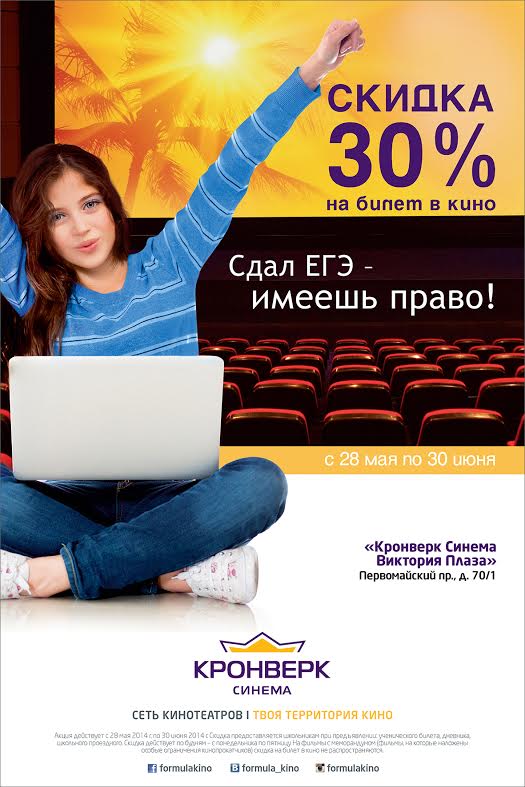 С 28 мая по 30 июня кинотеатр «Кронверк Синема» в ТРЦ «Виктория Плаза» будет предоставлять школьникам по будним дням скидку 30%.