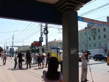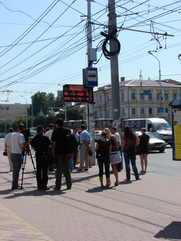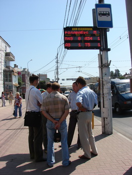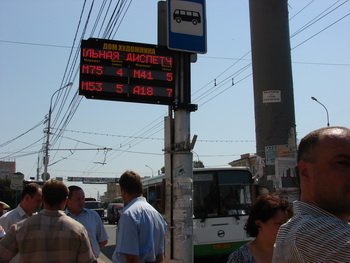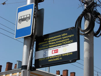 — Это первое табло такого рода, ещё три планируется установить в ближайшем будущем. Проект экспериментальный, если он окажется удачным, по городу будут размещены не менее 100 табло практически на всех остановках , где проходят более одного-двух маршрутов, — отметил Сергей Тарарако. — Остановка «Дом художника» была выбрана в связи с тем, что сюда сходится наибольшее количество маршрутов, которое сегодня подключено к системе ГЛОНАСС. На сегодняшний день подобных табло в России пока нет, а всего в Рязани система ГЛОНАСС установлена на 501 единице техники. Коммерческий транспорт оснащён на 30%, муниципальный — на 80%, к сентябрю этого года система ГЛОНАСС будет установлена на всём муниципальном транспорте, а на коммерческом — до конца 2011 года.
