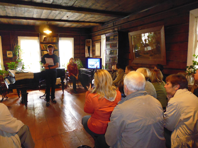 Первую остановку воспитанники экологического клуба сделали в доме-музее русского композитора Сергея Танеева в селе Дютьково. Здесь на научно-практической конференции о творчестве Кирсанова с отчётами о результатах исследований жизни и творчества художника выступили воспитанники клуба, а также волонтёры и краеведы, ведущие поисковую работу в селе Аграфенина Пустынь. Известно, что Михаил Кирсанов родился в этом селе и прожил в Рязанской губернии до сорока лет. Вторую половину жизни художник провёл в Звенигородском районе.