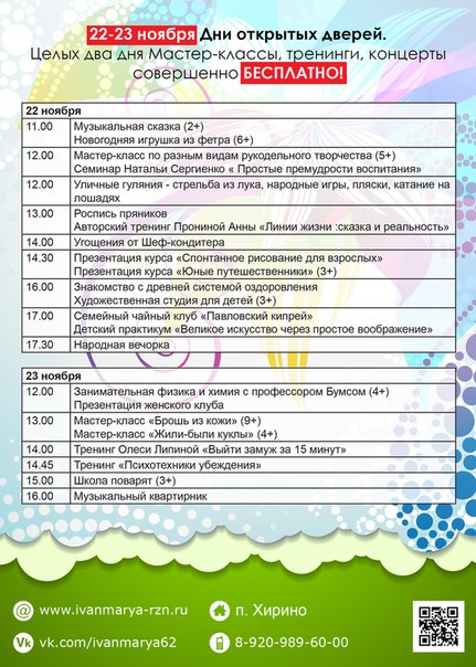 22 ноября в 11.00 для юных гостей и их мам будет проведён мастер-класс по изготовлению новогодней игрушки из фетра, кроме того, малыши смогут поучаствовать в музыкальной сказке «Заюшкина избушка» и получить сладкие призы. В 12.00 на семинаре «Простые премудрости воспитания» психолог Наталья Сергиенко поделится опытом и знаниями в сфере взаимоотношений с ребёнком, а ребят в 12.00 ждёт научно-увлекательное занятие с профессором Бумсом. Также в 12.00 творческий коллектив «С нами в прошлое» организует мастер-класс по стрельбе из лука и средневековым танцам, желающие смогут научиться плести на бердо, дощечках и вилочке.. В 13.00 детский практикум «Великое искусство через простое воображение» проведёт психолог Анна Пронина (Москва). В 16.00 вы сможете познакомиться с древней системой оздоровления рэйки — искусством исцеления руками, а для детей будет работать художественная студия, где малыши научатся расписывать матрёшек. В 17.00 приходите на семейное чаепитие в русских традициях от чайного клуба «Павловский кипрей». В субботу с 12.00 по территории клуба можно будет прокатиться на конях.