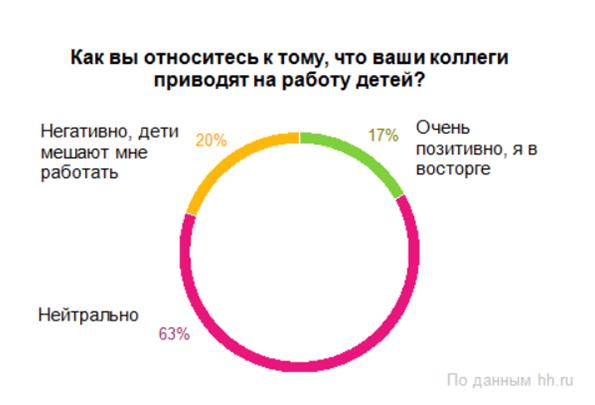 По словам родителей, на работе все относятся с пониманием к присутствию детей. Более того, 57% рязанцев уверены, что их коллеги в восторге от появления ребёнка в офисе. Это мнение не подтверждается результатами опроса бездетных сотрудников рязанских компаний. Так, детским визитам рады лишь 17% из них, 63% относятся к подобным посещениям нейтрально, а 20% и вовсе высказываются резко негативно (дети отвлекают, не дают сосредоточиться, мешают работе).