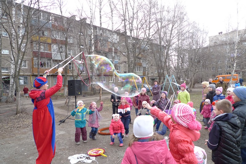 После субботника благодаря Сергею Пупкову на площадке состоялся праздник с анимационной программой и гигантскими мыльными пузырями. Все дети получили вкусные призы за участие в весёлых конкурсах.