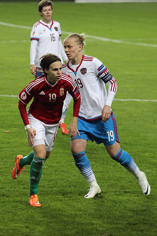 С первых минут россиянки взяли инициативу в свои руки. Наша команда старалась действовать активно, атаковать не только через центр, но и флангами. Вот только дивидендов в виде не то что голов, даже опасных моментов, это не приносило. Соперник оборонялся чётко, спокойно и уверенно, при этом успевал ещё и контратаковать. Как результат — два опаснейших момента у российских ворот уже к середине тайма. Хорошо, что Эльвира Тодуа выручила своих партнёрш по команде. В первом тайме лишь раз россиянки могли поразить ворота соперника, но после удара Анны Чоловяги хорошо на линии сыграл страж ворот Венгрии. На перерыв команды ушли при счёте 0:0.
