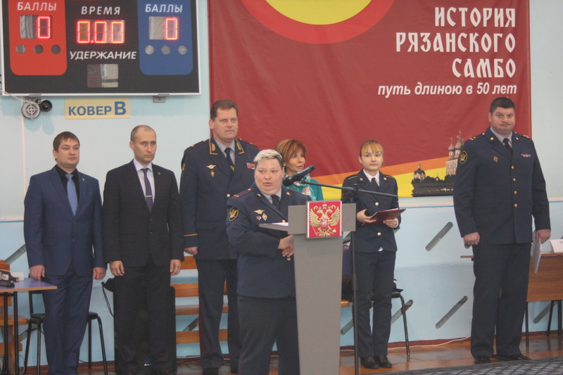 На церемонии открытия чемпионата его участников, тренеров, арбитров, болельщиков тепло приветствовали начальник рязанской Академии ФСИН, генерал-майор внутренней службы Александр Крымов, старший инспектор отделения служебной и физической подготовки и взаимодействия с обществом «Динамо» управления кадров ФСИН России подполковник внутренней службы Надежда Шемякина, первый заместитель начальника УФСИН по Рязанской области полковник внутренней службы Константин Пулкачев, президент рязанского регионального отделения Всероссийской федерации самбо Галина Трушина, временно исполняющий обязанности председателя Рязанской областной организации Всероссийского спортобщества «Динамо» Дмитрий Харькин.