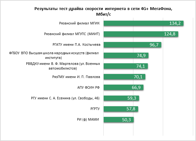 Самые высокие скорости мобильного интернета в сети 4G+ были зафиксированы рядом с Рязанским филиалом Московского государственного университета культуры и искусств — 134,72 Мбит/c, у Рязанского филиала Московского государственного университета путей сообщения — 124,8 Мбит/с. Замыкает тройку рязанских вузов-лидеров по итогам тест-драйва РГАТУ имени П.А. Костычева. Скорость интернета около него составила 96,68 Мбит/c.