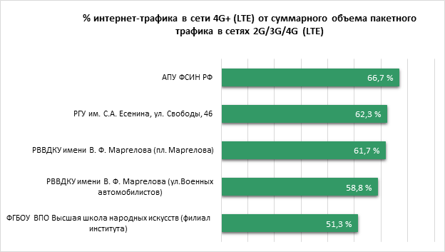 Первое место в рейтинге заняла Академия права и управления ФСИН России. Курсанты академии активнее всего пользовались услугами 4G+ (более 66,7% от всего объёма интернет-трафика) в течение учебного года. Второе место занимает Рязанский государственный университет им. С.А. Есенина (здания на улице Свободы, 46) — 62,3%. Замыкает тройку лидеров Рязанское высшее воздушно-десантное командное училище имени генерала армии В. Ф. Маргелова (площадь Маргелова) с результатом 61,7%. По результатам рейтинга видна прямая зависимость скорости мобильного интернета в сети 4G+ от объёма потребления интернет-трафика.