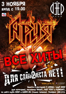 3 ноября в клубе DEEP пройдёт концерт группы «Ария», стоимость билетов — от 1200 рублей.