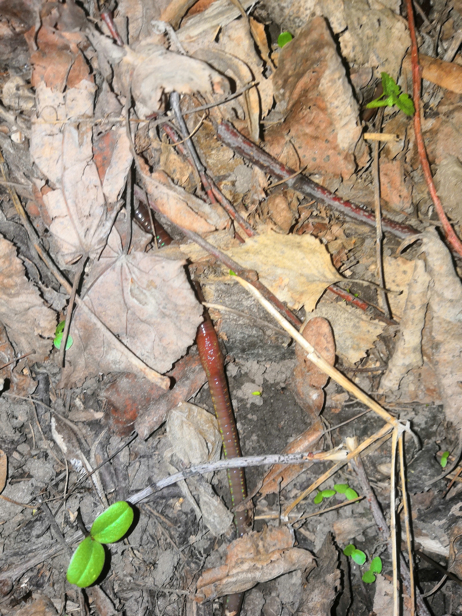 На фото запечатлён дождевой червь: их массовая активизация и выход на поверхность и являются причиной оживания сухой подстилки. Гигантских червей размером до 15 сантиметров можно увидеть в ближайшие тёплые вечера. Для этого нужно сконцентрироваться на звук и направить фонарь на источник звука. Внимание, кольчатые черви могут удивить натуралиста небывалой прыткостью.