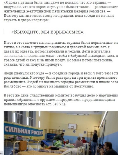 В октябрьской публикации приводится цитата Ремизовой: «Я дома с детьми была, мы даже не поняли, что это взрывы, — подумали, что это порох жгут, у нас бывает такое, — рассказывает жительница желтухинской пятиэтажки Валерия Ремизова. — Поэтому мы значения этому не придали, пока соседи не начали стучать в дверь квартиры: «Выходите, мы взрываемся». И вот в этот момент мы испугались, взрывы были нормальные, не тихие, а я была с грудным ребенком и девочкой восьми лет, я давай их одевать, потом выбежали и уехали. Дети испугались, заплакали, я позвонила маме, чтобы с бабушкой выходили, мол, на трассе детей ссажу и за ними поеду. Но мама потом позвонила, сказала, что на попутке приедут».