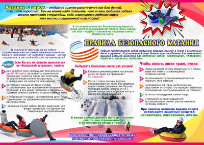 – следует правильно выбирать места отдыха: они должны быть безопасны, находиться вдали от рек, деревьев, зданий и сооружений, поскольку катание на ледянках, «ватрушках» и санках приводит к развитию высоких скоростей, а ребёнок чисто физически не сможет сам справиться с управлением инвентарём, а следовательно и уберечься от столкновения, либо выездом на опасные территории