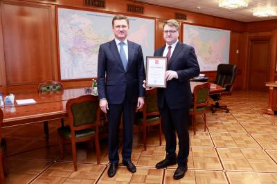 Александр Новак передал Семёну Сазонову Благодарность президента РФ за большой вклад в развитие топливно-энергетического комплекса и многолетнюю добросовестную работу.