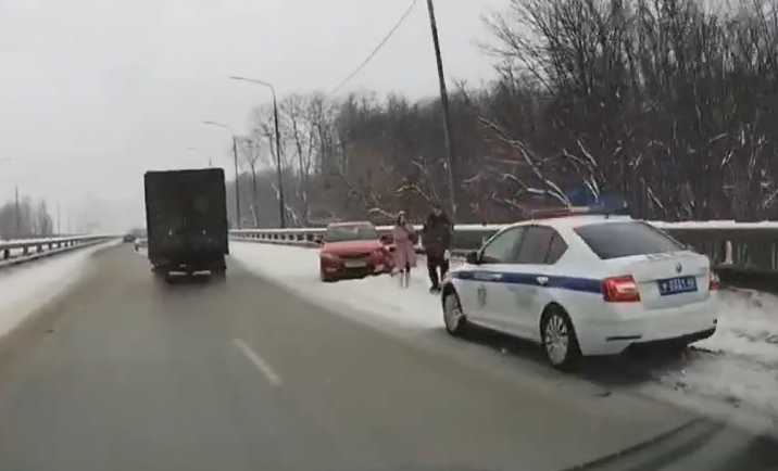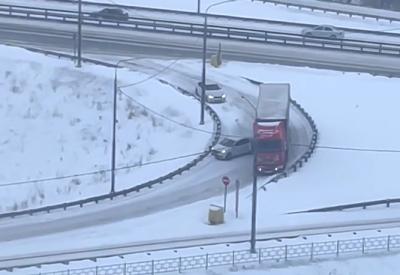Первое ДТП на развязке возле торгово-развлекательного центра «Круиз» на съезде из микрорайона Канищево в сторону выезда из города, где столкнулись легковая и грузовая автомашины.