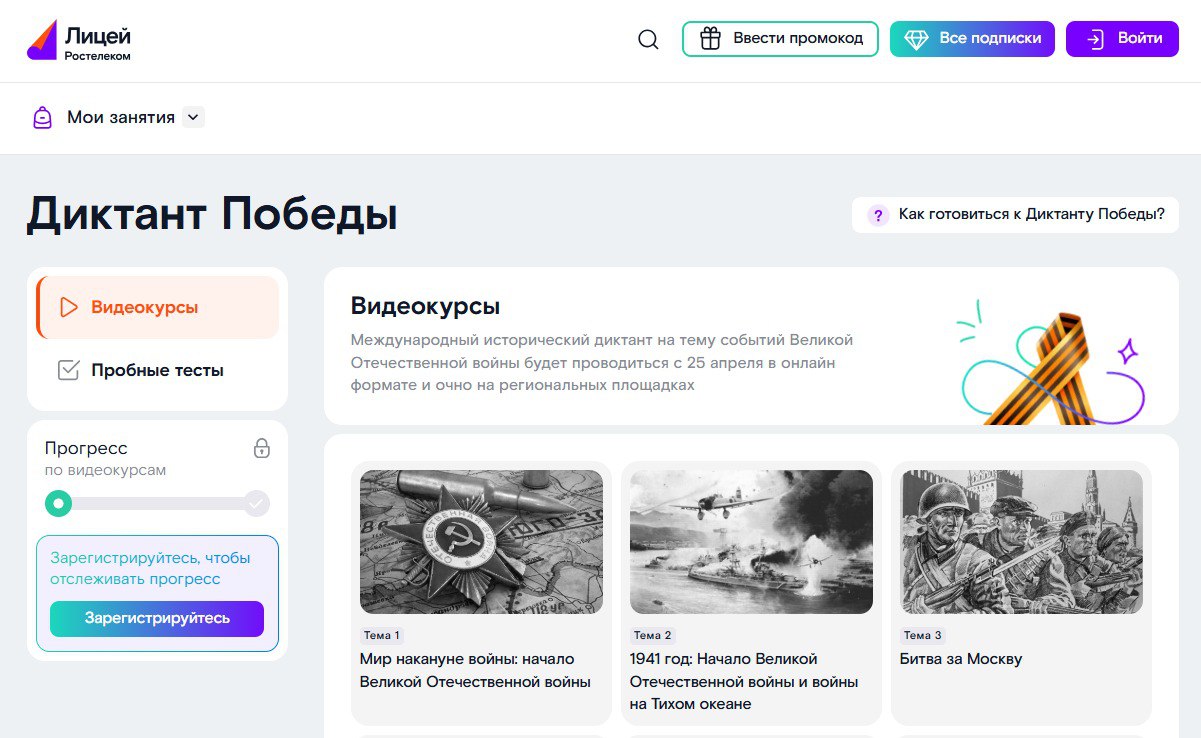 На образовательной платформе «Ростелеком. Лицей» размещён видеокурс от Российского военно-исторического общества, который освежит знания о Великой Отечественной войне. Систематизировать знания помогут конспекты и тесты по каждой теме. Пять пробных вариантов «Диктанта Победы» прошлых лет, которые также представлены на образовательной платформе, позволят пользователям полностью погрузиться в атмосферу предстоящей акции и реально оценить уровень подготовки.