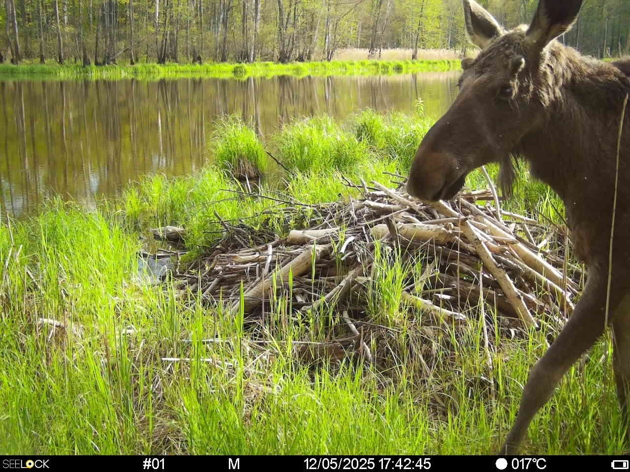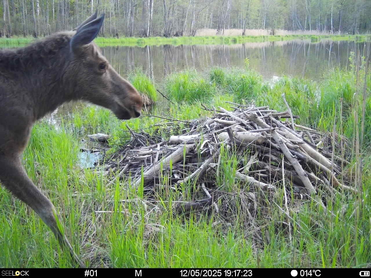 Также фотоловушка в заповеднике лосей на фоне бобровой хатки. Самца на снимке нетрудно распознать по бугоркам будущих рогов и бороде. Однако отмечается, что борода-серьга сама по себе не является надёжным признаком, так как бывает и у некоторых самок, а вот рога — прерогатива самцов.