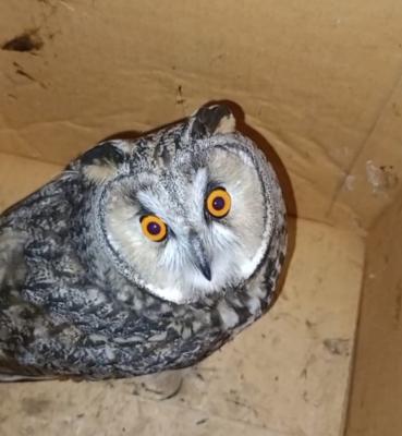 На этот раз спасенная это взрослая ушастая сова Asio otus – самый распространённый вид городских сов, но при этом, как и любой хищник, все равно достаточно редкий житель города. Очевидцы рассказли, как сова летела, потом села на землю - и тут же на неё накинулись вороны, начали клевать. Птицу удалось отбить и посадить в коробку.